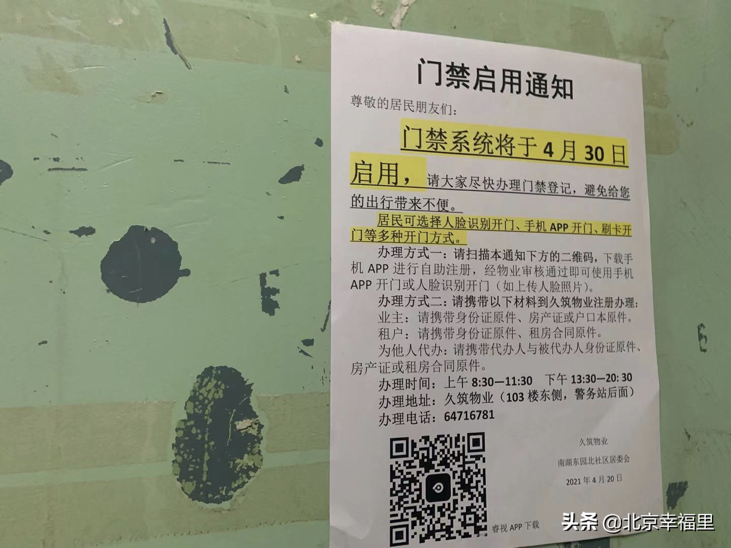 晓晨看到电梯里门禁启用通知,已于4月30日启用,业主需携带身份证、房产证或户口本,租户需携带身份证、租房合同去物业办理,办理成功后居民可选择人脸识别、手机APP、刷卡开门等多种方式进出小区。