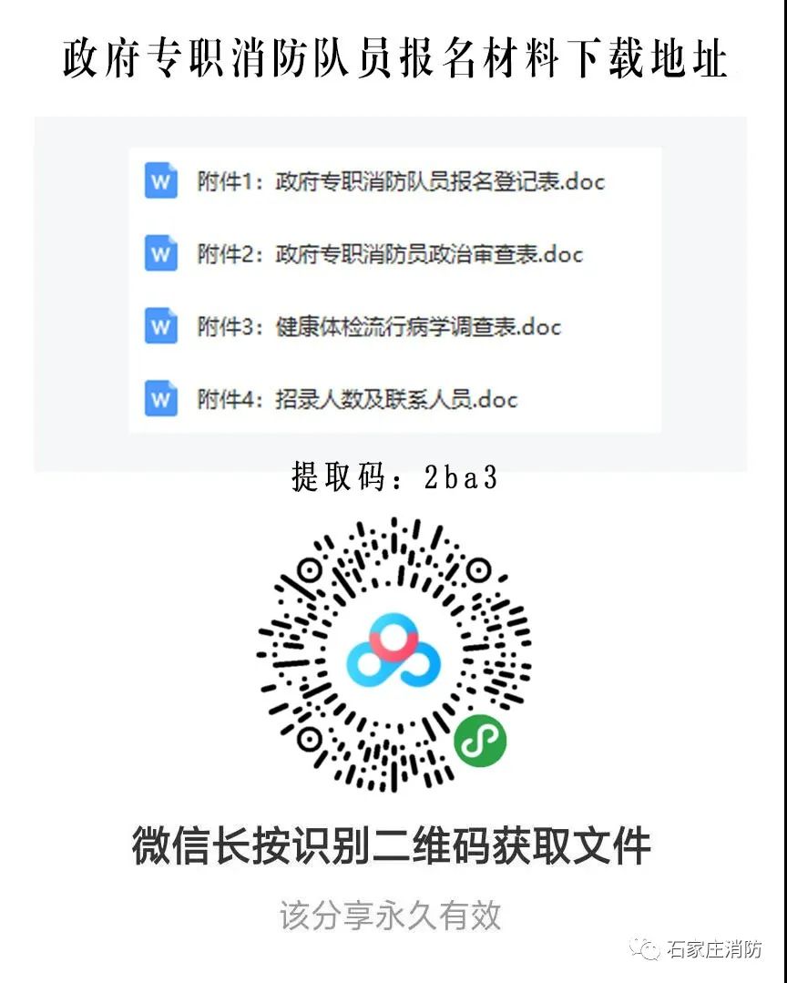 4、报名需交材料:微信扫描下图二维码进行下载并填写专职消防队员报名登记表、政治审查表(正反面打印),交近期免冠1寸红底照片4张,本人身份证原件及复印件二份、户口本复印件一份、毕业证原件及复印件一份、(报名驾驶员者需携带驾驶证及复印件)、有当兵经历和专业技术特长的,将相关材料原件及复印件一并附后。达不到报名条件的、资料准备不齐全者,不予受理。