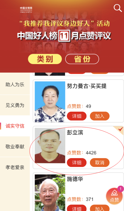 投票方式:进入投票界面,于“诚实守信”中找到排在第10位的彭立滨,点击“加入”→点击屏幕右下角圆形“点赞”图标→进入点赞界面→点击“点赞评议”