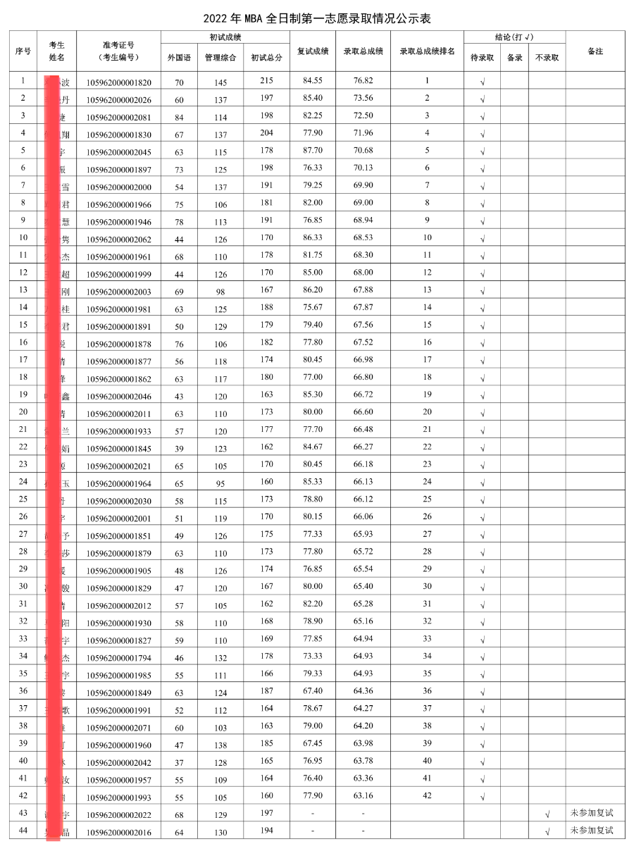 桂林理工大学2022考研全日制MBA,根据国家线160分划线,一志愿上线44人,除2人未参加复试,剩余42人均被录取。上线人数跟2021考研差不多,2021考研桂林理工大学全日制MBA上线人数为46人。所以,学校整体还是照顾一志愿考生的。