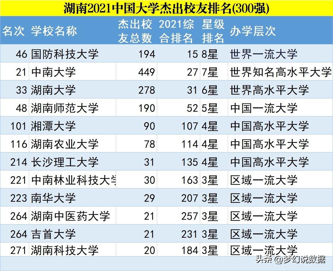 杰出毕业生校友包括杰出科学家、政界英才、杰出企业家、杰出文学艺术家和杰出运动员等。校友会建立一套评价指标,并对全国大学进行了排名,其中湖南省内大学杰出校友如下。