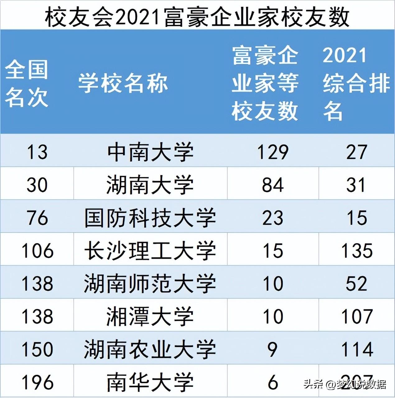 根据全国高校富豪企业家排行榜,中南大学以129人排第1,湖南大学以84人排在第2,国防科大以23人排在第3,长沙理工大学以15人排第4,湖南师范大学与湘潭大学以10并列第5。