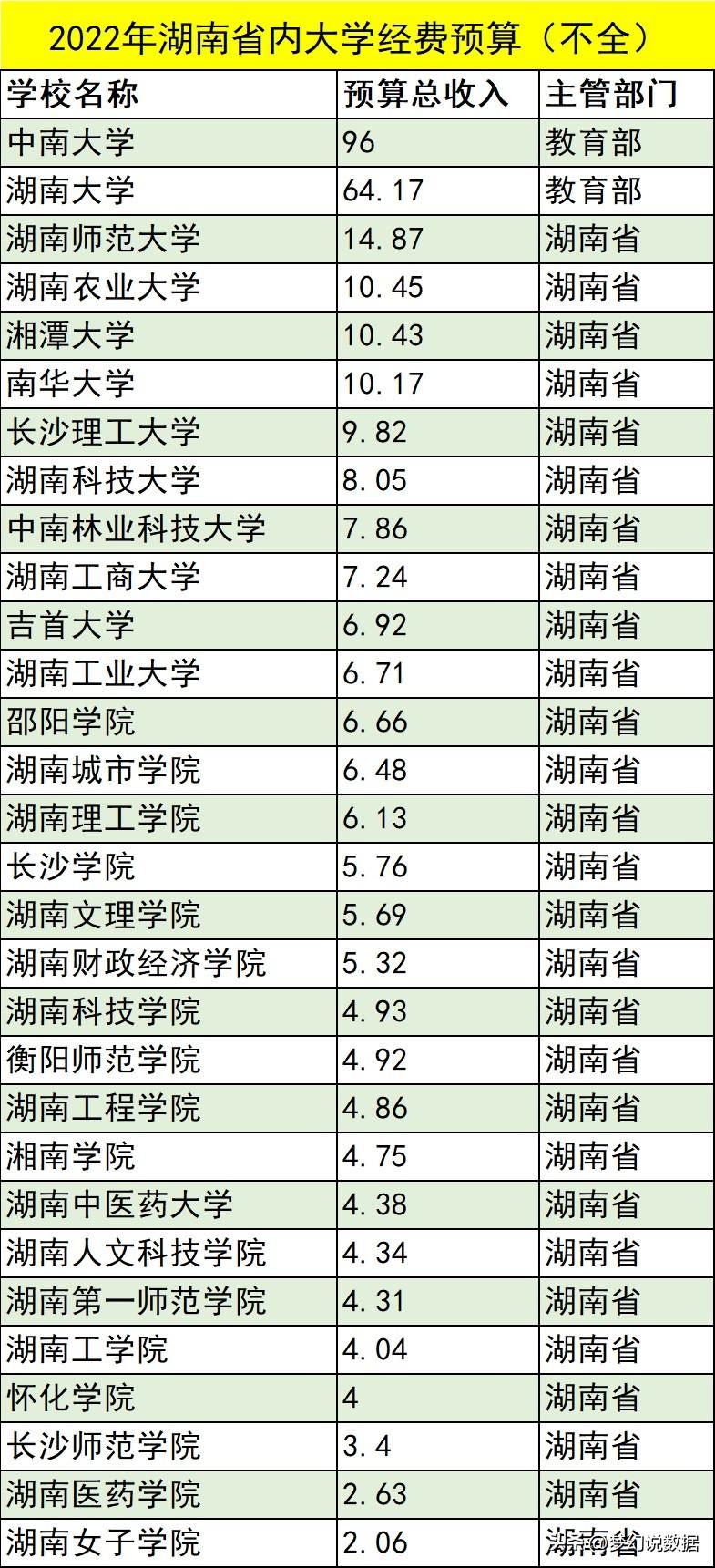 经费是大学良好发展的基础。中南大学预算总收入为96亿元,湖南大学预算总收入为64.17亿元,湖南师范大学14.87亿元,湖南农业大学10.45亿元,湘潭大学10.43亿元,排在前5。