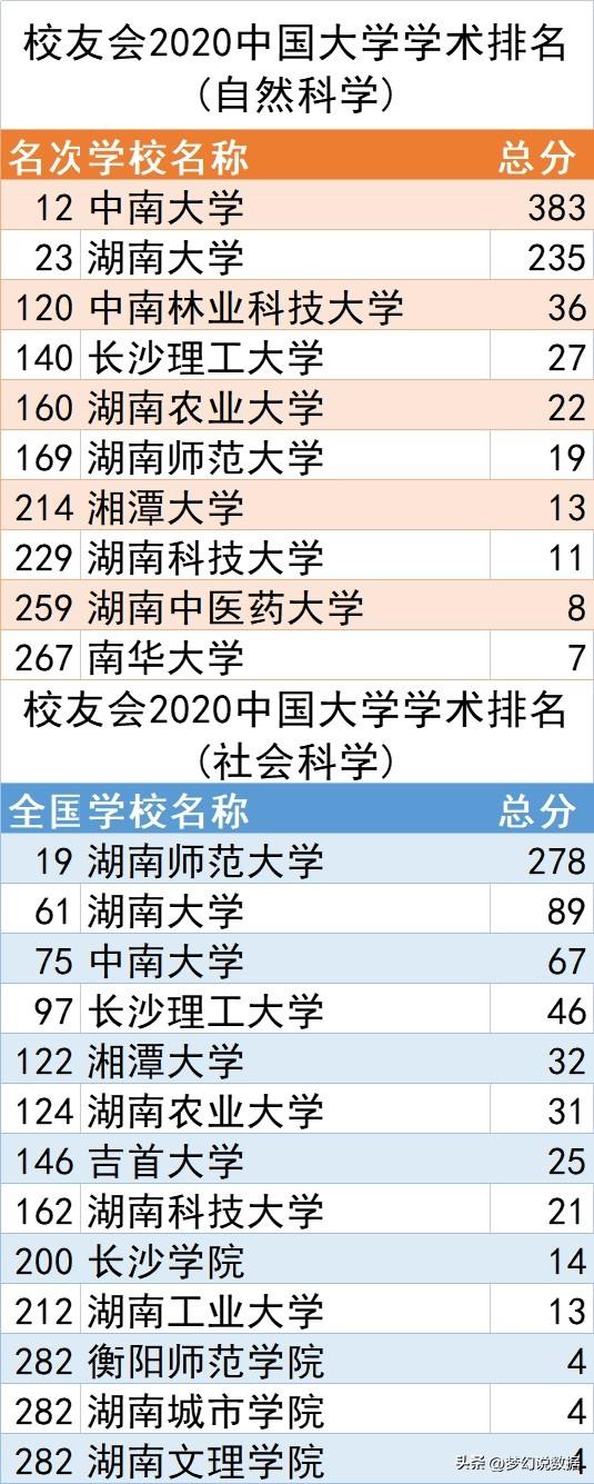 根据校友会2020大学学术排名(自然科学)榜发现,中南大学、湖南大学、中南林业科技大学、长沙理工大学、湖南农业大学排在前5,其中中南大学与湖南大学占绝对优势;社会科学榜显示,湖南师范大学排在第1,湖南大学、中南大学、长沙理工大学、湘潭大学排在2-5位。
