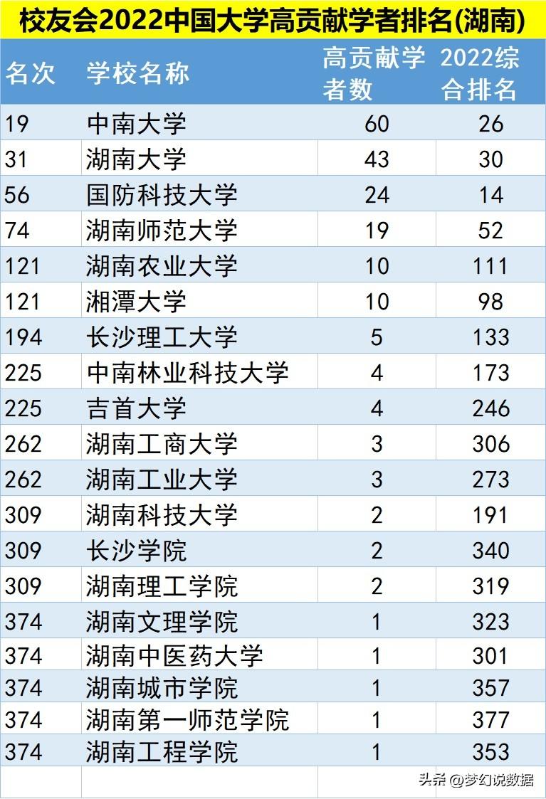 根据2022年高贡献学者来看,中南大学以60人排第1,湖南大学以43人排在第2,国防科技大学排在第3,湖南师范大学19人排在第4,湖南农业大学和湘潭大学10人并列第5。