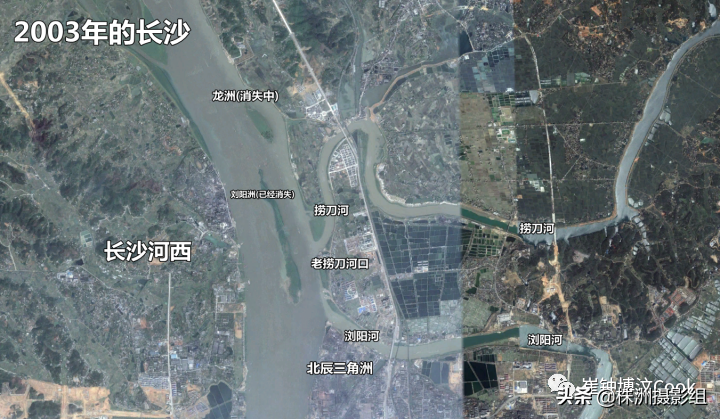 8.捞刀河的湘江河口在17年前发生过改道工程,老的河口被移动到了北边2KM处,填河后的地方才有了很容易迷路的湘江世纪城,捞刀河原名捞塘河,其流域内刀剪制作非常出名,可能是明朝三国演义刚诞生,比较有名,关公也确实战过长沙,所以都市传说,关公落刀浏阳河口,青龙偃月刀的青龙逆流转进捞塘河内,这条河就改名捞刀河了,落刀的地方就是浏阳河口落刀咀(嘴),Mobil美孚原来在落刀咀附近建有大型的储油池,给船加油的,所以这里原来叫洋油池。改道后因为怕龙洲阻碍湘江行洪,挖了一半,住户都被迁上岸,浏阳洲因为湘江蓄水,已经完全淹没在福元路大桥之下的江中了。