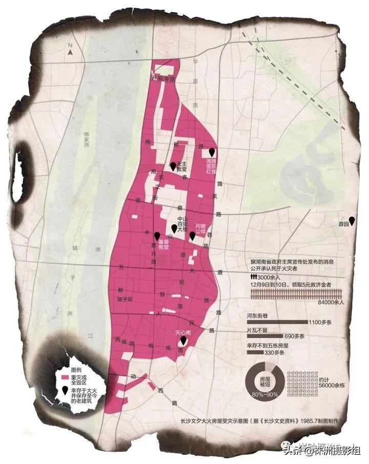58.长沙是二战中损毁最严重的城市之一,地面建筑几乎全面烧毁,这也是为什么顶着第一批历史文化名城的长沙几乎找不到老建筑的原因,当然City council也不怎么在意,万达挖出了宋代长沙城墙依然丢一边去让位给万达搞生意。这是文夕大火的火烧图: