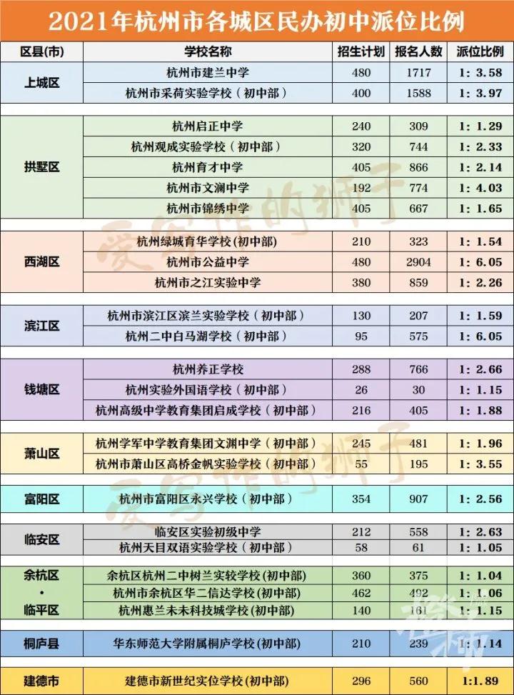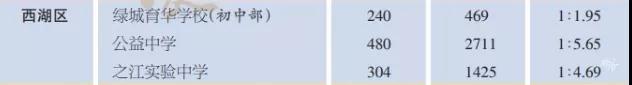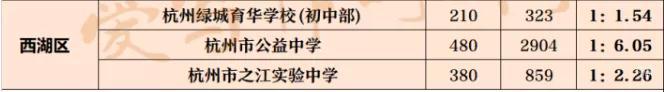 其中,杭州市公益中学和杭州二中白马湖学校(初中部)的派位比都达到了1 :6.05,而去年并没有学校的派位比超过1:6,去年最高派位比为公益中学的1:5.65 。