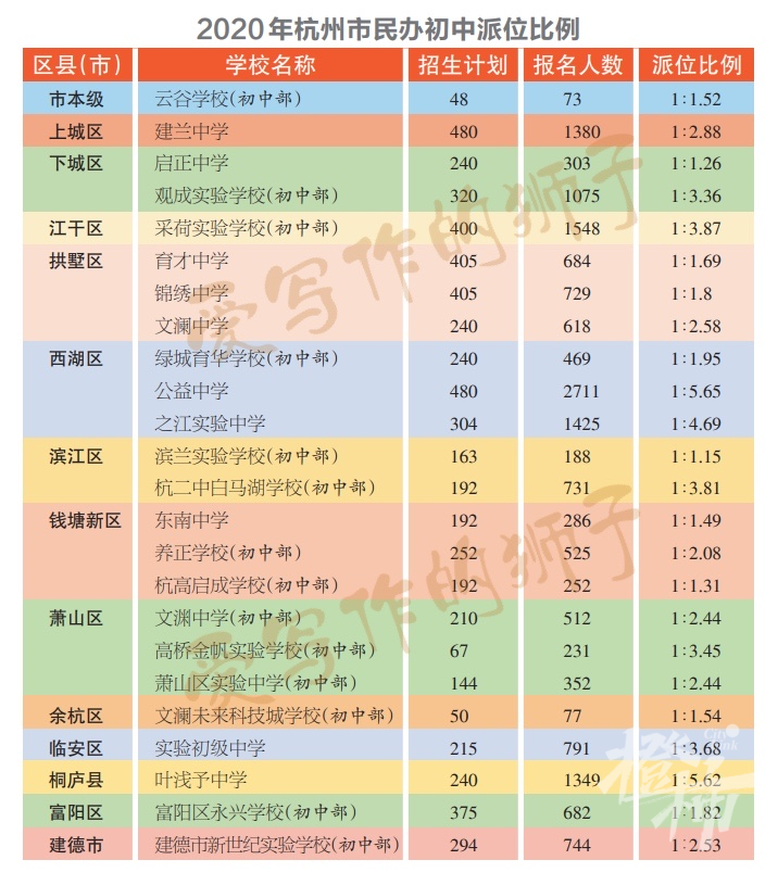 杭州市文澜中学,今年派位比1:4.03。