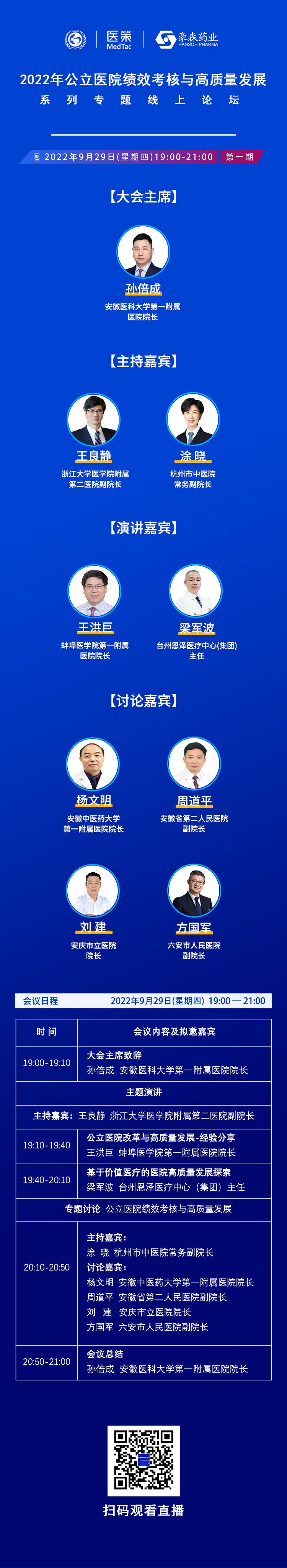 为充分落实绩效考核的“指挥棒”作用,深挖医院绩效考核指标内涵,明确医院绩效结果应用,扎实推进公立医院高质量发展,9月29日,由中国医药教育协会主办,医策智库承办,豪森药业协办的“公立医院绩效考核与高质量发展”系列专题线上论坛首场直播如期举办。安徽医科大学第一附属医院院长孙倍成、浙江大学医学院附属第二医院副院长王良静、蚌埠医学院第一附属医院院长王洪巨、台州恩泽医疗中心(集团)梁军波、杭州市中医院常务副院长涂晓、安徽中医药大学第一附属医院院长杨文明、安徽省第二人民医院副院长周道平、安庆市立医院院长刘建、六安市人民医院副院长方国军围绕公立医院绩效考核与高质量发展展开全方位、系统化的探讨与分享。安徽医科大学第一附属医院院长孙倍成为会议致辞。