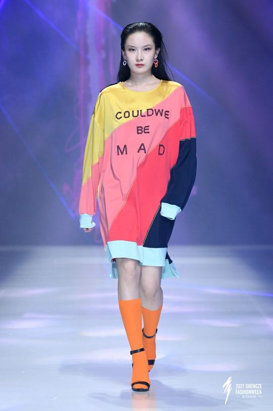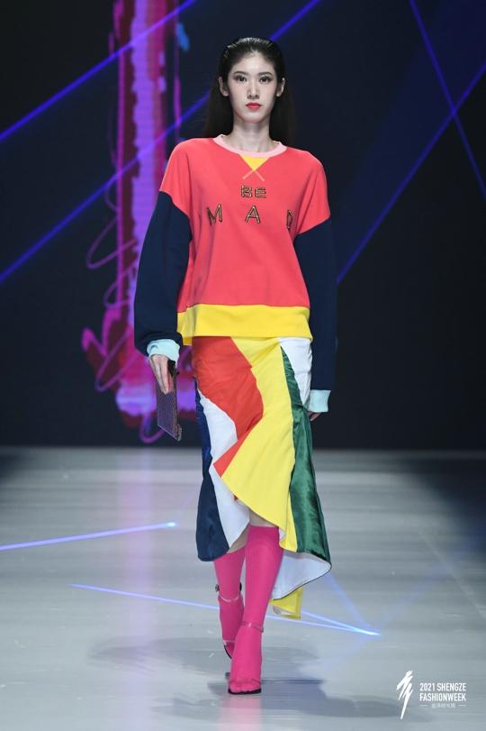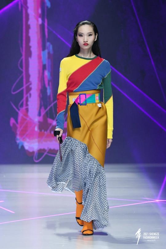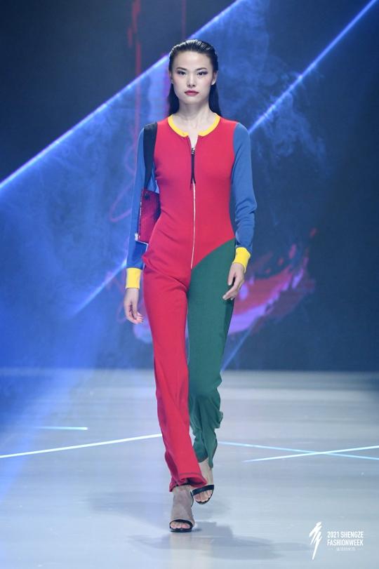 “疯狂de丝绸” 融合了抽象艺术和工业建筑风格,以不对称分割和几何形状对女性身体重新解构定义。设计师运用弧线分割、抽褶、开衩等设计点,在服装不同位置、使用不同面料,碰撞呈现出独特的惊艳效果。通过面料撞色拼接多元化色彩系列,看似对比强烈的不同色相,在新的配色规则下呈现出和谐的艳丽感。