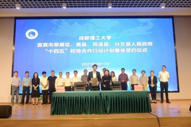9月17日,成都理工大学与宜宾市翠屏、高县、筠连、兴文四区(县)集体签订“十四五”校地合作行动计划,签约仪式在学校宜宾校区举行。成都理工大学科学技术发展研究院院长、地质调查研究院院长、产业发展研究院院长、合作与发展处处长徐仕海和翠屏区副区长刘可雕、高县副县长龚平、筠连县县委副书记、县长谢晓丹、兴文县副县长谢庆分别代表学校和四区县签订了“十四五”校地合作行动计划。