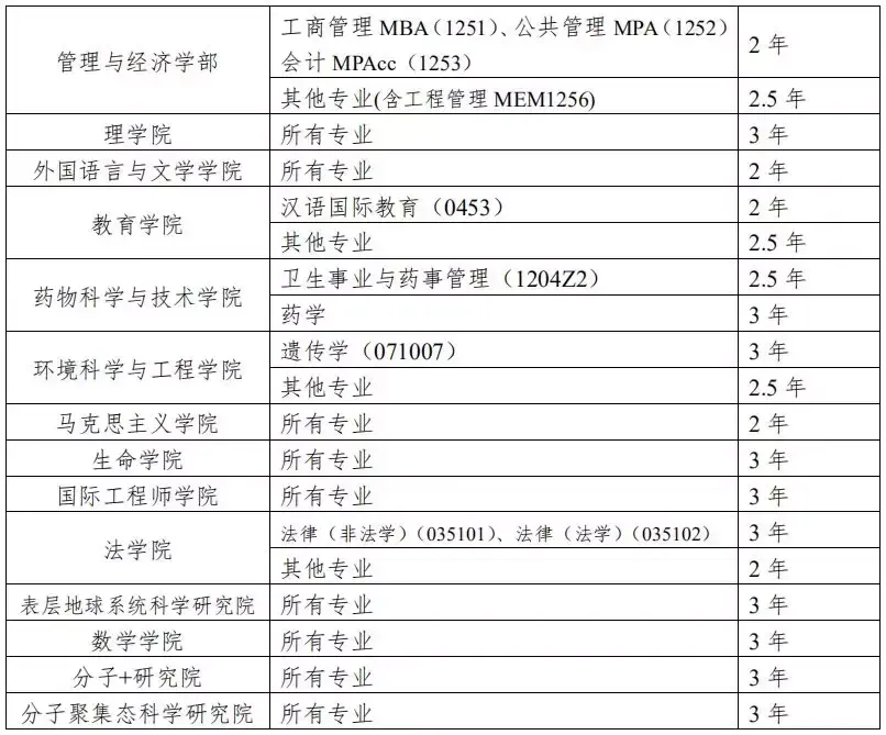 除上表所列学院及专业外,其他学院的所有专业学制均为 2.5 年。新生入学后双向选择指导教师。