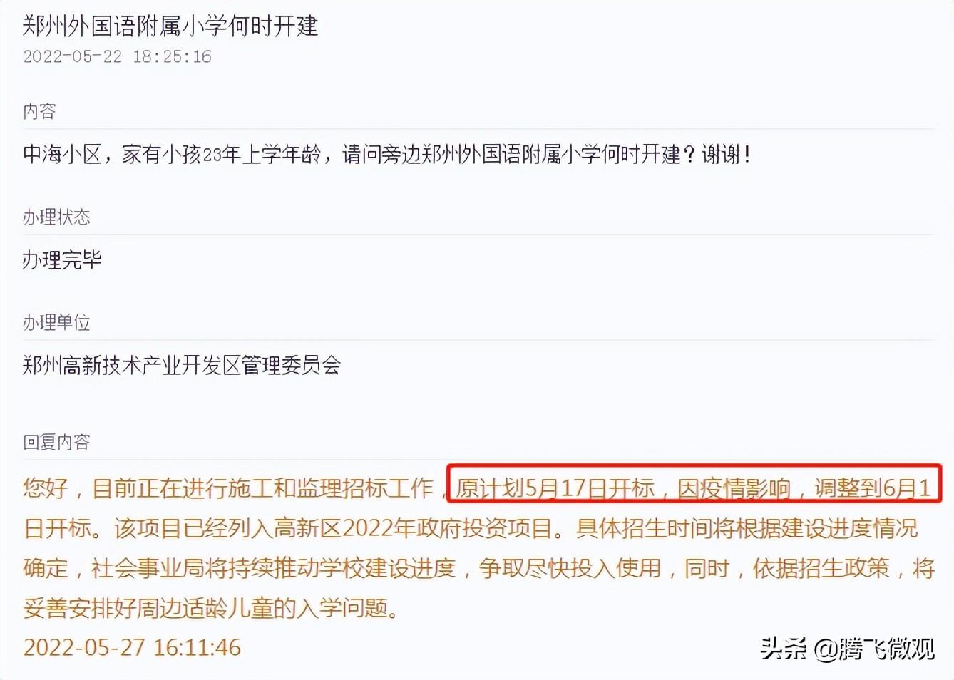 高新区管委会回复(2022.03.09):2019年郑州高新技术产业开发区管委会对高新区郑州外国语学校附属小学建设项目建议书进行批复,然后完成设计招标和方案设计,后该区域规划调整,班级数增加,对方案重新进行了设计,目前文勘地勘已经结束,施工图纸已经完成,已经完成预算价编制工作,正在进行招标控制价审核,然后按照有关招投标程序进入施工阶段。该项目已经列入高新区2022年政府投资项目。计划2022年6月正式开工。符合招生政策的适龄儿童,社会事业局将按照招生政策予以解决。感谢您对高新教育的关心与支持。