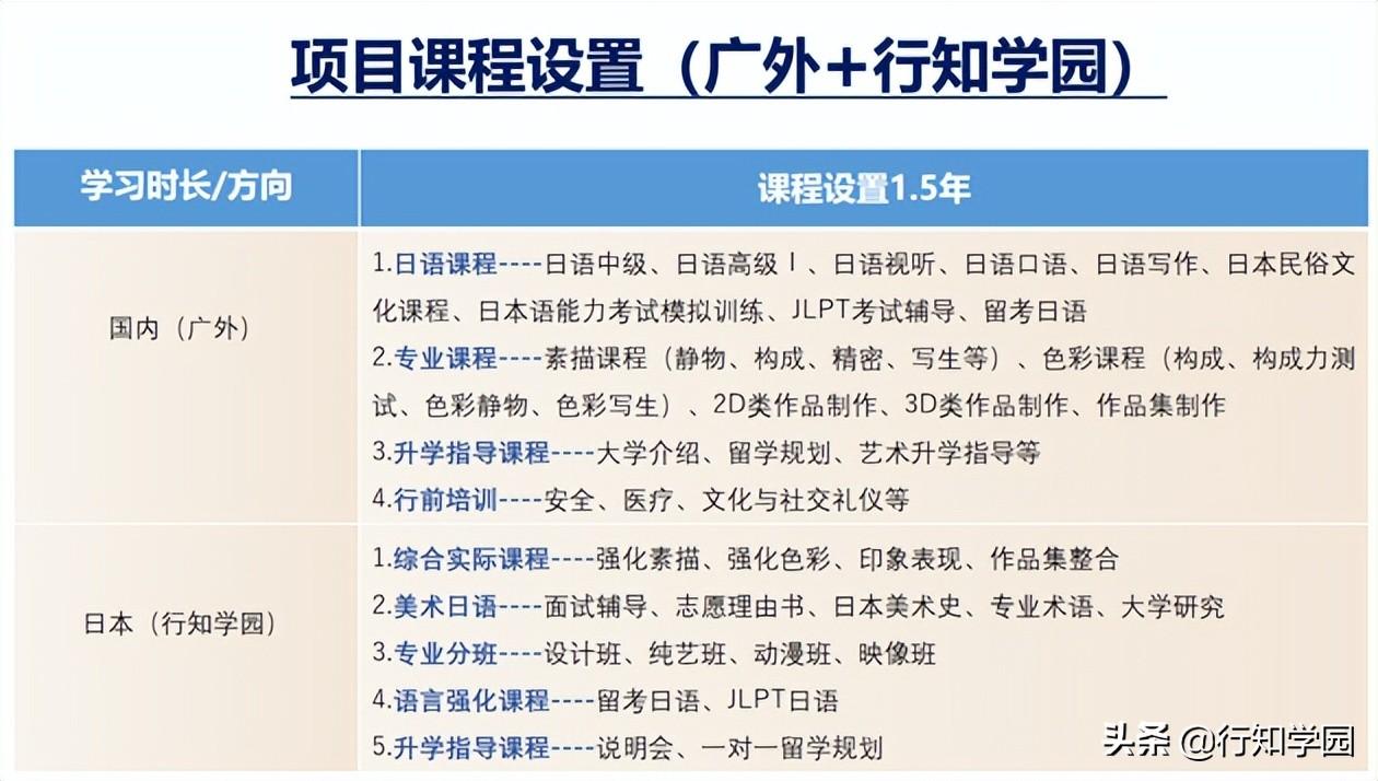 行知学园广州教学基地课程设置全面,涵盖EJU考试各科目和TOEFL训练,以及为艺术学生开设的作品辅导课程等。学制为1年广外+9个月日本行知学园(实际学习时长根据个人大学申请情况而定)+ 4年日本大学本科,2022年9月入学后,在广外学习到次年7月(期中提供6月在香港参加EJU留考的机会),之后留学日本,在日本行知学园学习后,再入读次年4月的日本大学本科。