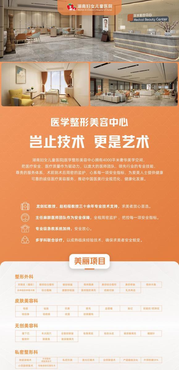 湖南妇女儿童医院医学整形美容中心以中国医师协会美容与整形医师分会常委龙剑虹教授为核心的医师团队,以丰富的经验,创新的理念,不断精进技艺,以求美者的需求为核心,回归医疗本质,以技术为根本,为顾客提供效果至上的品质塑美体验。