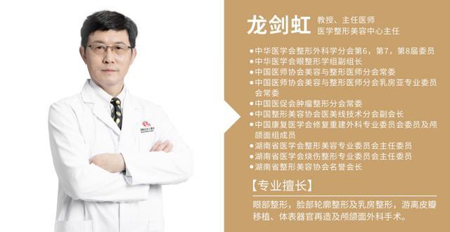 龙剑虹教授是湖南妇女儿童医院医学整形美容中心主任,也是中南大学湘雅医院整形美容外科创始人,是中国医师协会美容与整形医师分会常委、湖南省医学会烧伤整形专业委员会主任委员、湖南省医学会整形美容学组组长。