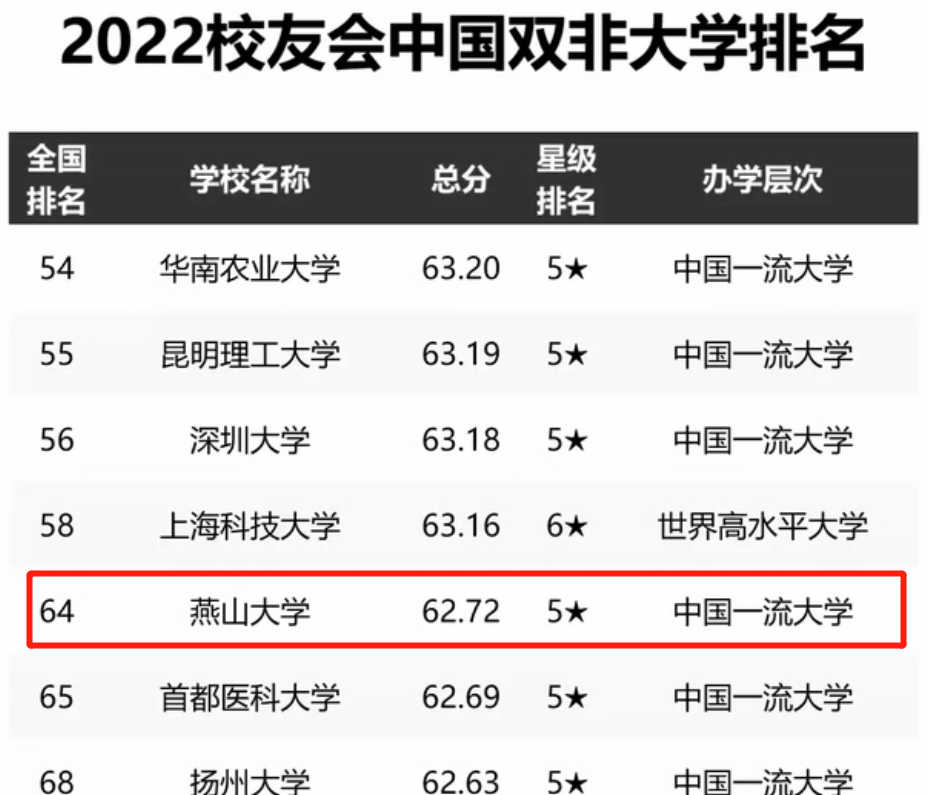 这里面南方科技大学和上海科技大学也都是双非,但是在2022年第二轮双一流评选中如愿进入了新双一流大名单,从高校等级上来看,也是高于燕山大学的。