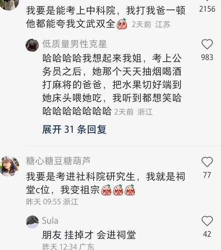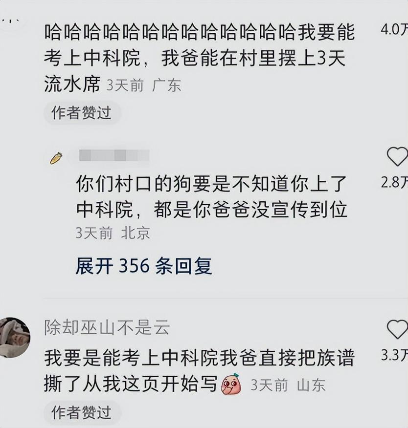 有的学生表示:“我要是能考上中科院,我爸直接把族谱撕了从我这页开始写!”还有的父亲能“在村里摆上三天流水席。”