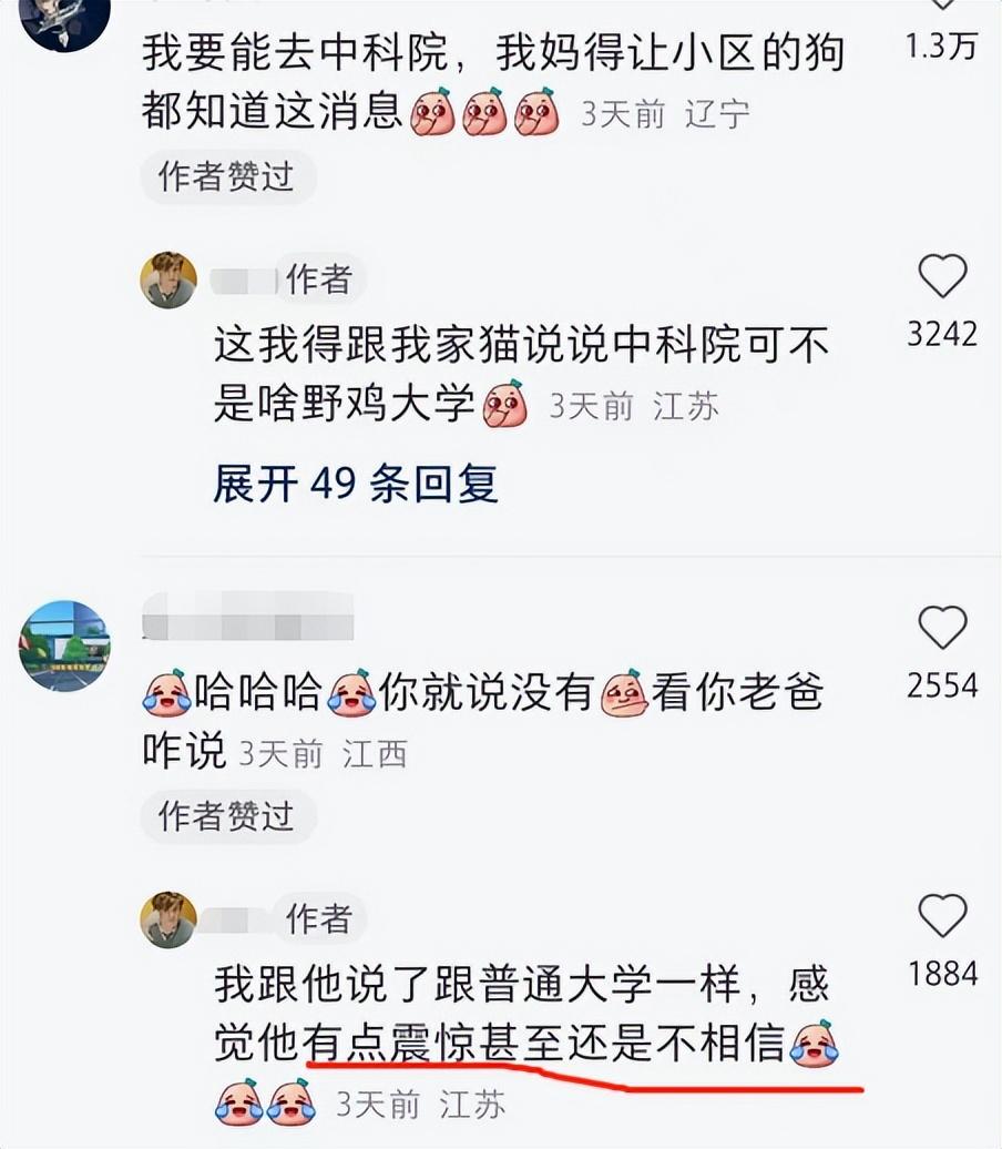 也有的同学表示:“但凡村头的狗不知道,都是你老爹宣传不到位。”或者“我妈得让小区的狗都知道这消息。”又或者“那我得和我家猫说说,中科院可不是野鸡大学”。