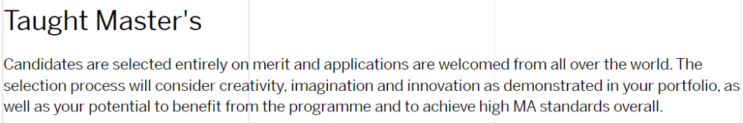 就以皇艺这个世界排名第一的艺术院校来说,由于申请者来自世界各个国家不同高等教育体系,它对于学历背景的要求基本等于没有。皇艺挑选候选人完全是根据作品集、文书、和视频中展示的创造力、想象力、足以进入专业学习的能力和潜力。
