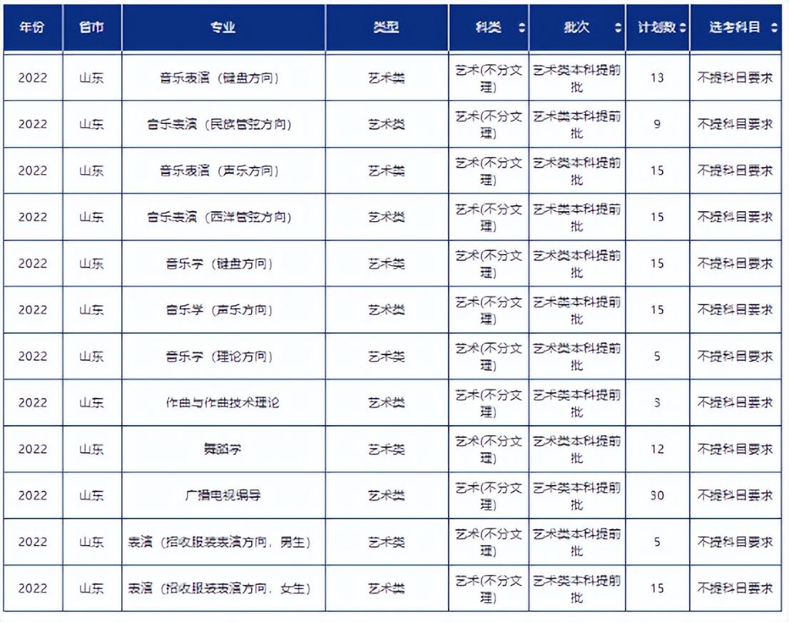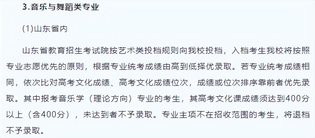 2022年招生计划分专业情况音乐类第一年使用统考成绩,音乐学、音乐表演位次在1000左右鼓励报考,音乐学(理论方向)、音乐表演(西洋管弦)、作曲位次在2000鼓励报考,音乐学(理论方向)要求文化成绩在400分以上。