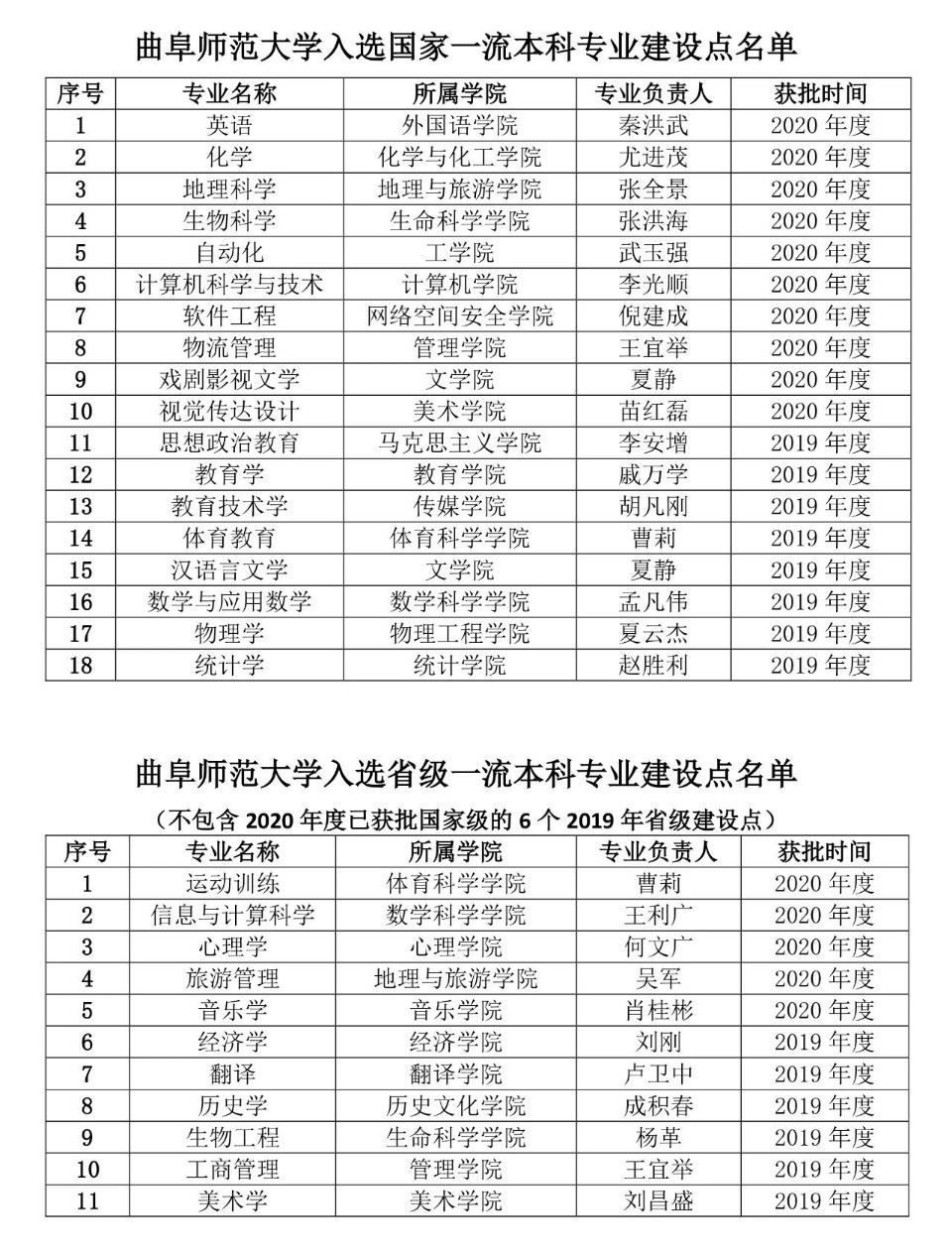 近日,教育部公布了2020年度国家级和省级一流本科专业建设点名单,曲阜师范大学英语等10个专业入选国家级一流本科专业建设点,运动训练等5个专业入选省级一流专业建设点。据悉,当前学校共获批国家级一流本科专业建设点18个、省级一流本科专业建设点11个,总数位居省属高校前列。