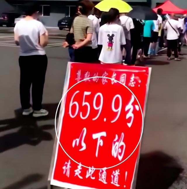 在办理入学的时候,学校要求学生按照成绩排队,分别摆放了5个牌子作为指示,5个分数段分别是704分以上、703.9-692分、691.8-677分、676.5-660分和659.9分以下。