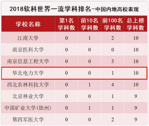 2018年7月17日,2018"软科世界一流学科排名"(ShanghaiRanking's Global Ranking of Academic Subjects)正式发布。华北电力大学共有10个学科进入世界一流学科榜单,1个学科跻身世界前100名。