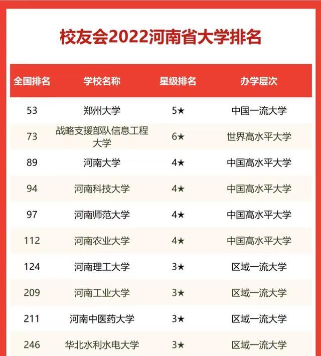 那么,对于河南省高校而言,哪些高校在2022年的排名中名次相对靠前呢?哪些高校的综合实力相对较强呢?下面,我们就来看一看校友会关于2022年河南省高校排名,看一看你的学校有没有上榜?仅供考生和家长参考。