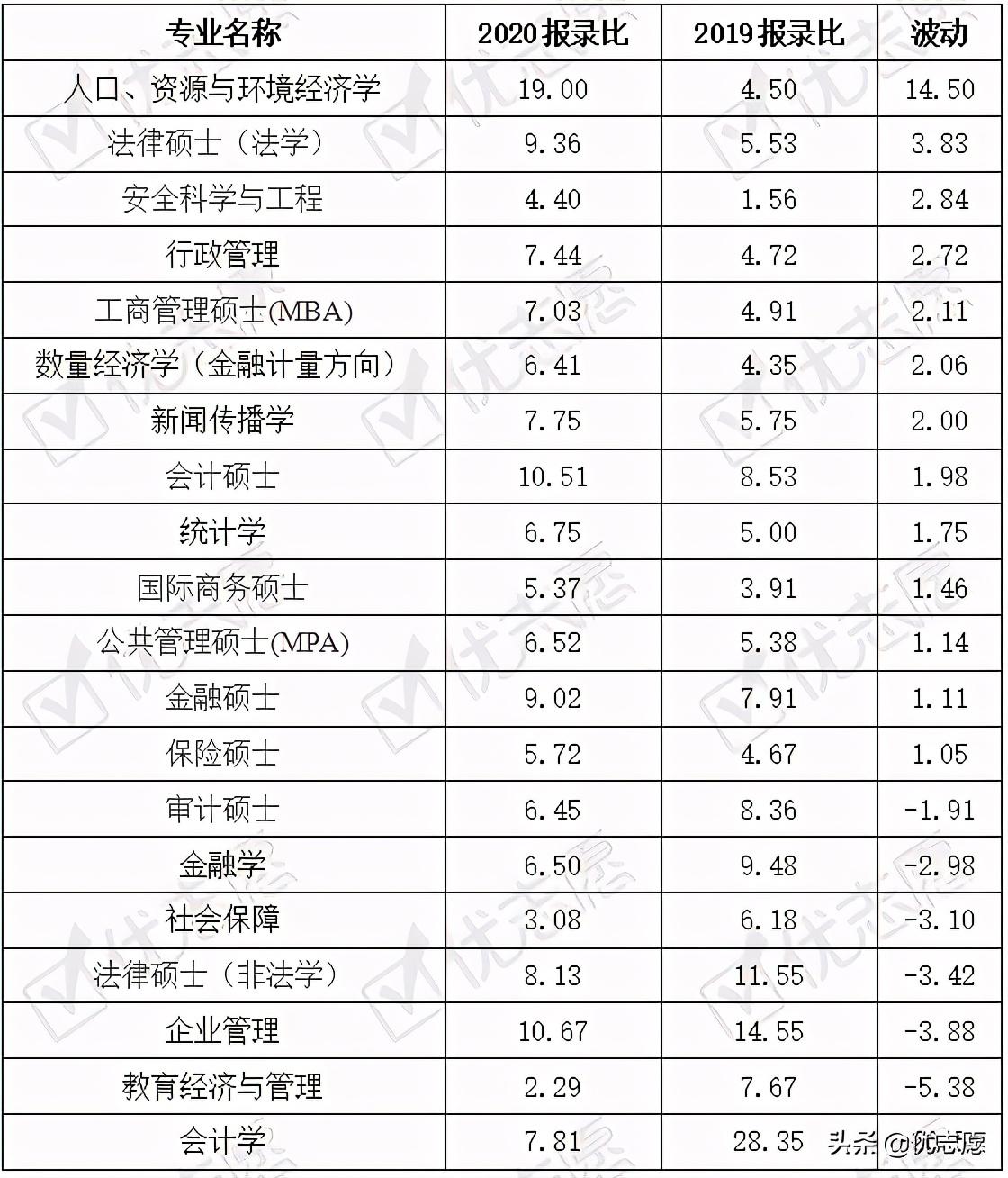 表1为首经贸2019-2020年报录比波动大于等于1的专业,报录比增加说明该专业2020年的报考难度提升,报录比减小说明该专业2020年的报考难度降低。