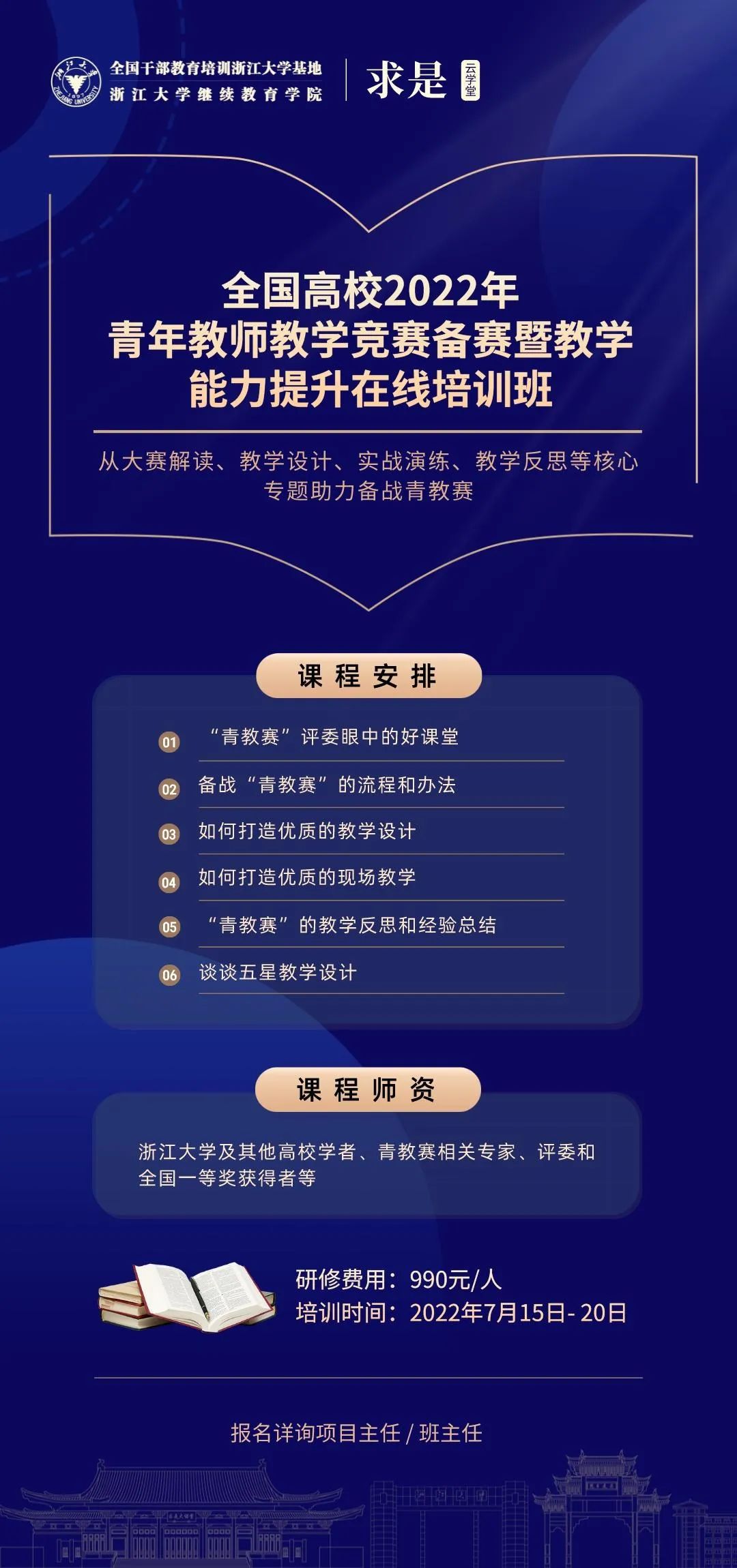 为了帮助广大高校教师全面了解大赛信息,准确把握大赛要求,做好赛前准备工作。同时为想借此机会提升教学能力的青年教师提供优质学习资源。浙江大学继续教育学院特邀请往届全国青教赛获奖教师及评审专家开展赛前在线培训,本次培训将从大赛解读、教学设计、实战演练、教学反思等核心专题助力大家备战青教赛,助力青年教师以赛促教,切实提升教学能力。