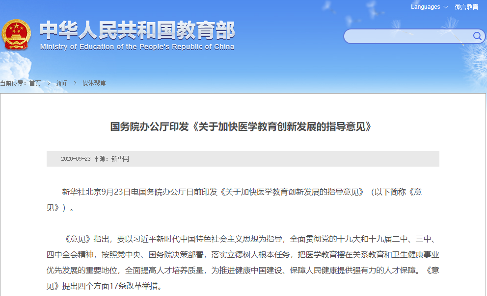 9月23日,国务院办公厅印发了《关于加快医学教育创新发展的指导意见》。9月25日,新华社以《这四类人才急缺,大幅度扩招!》为题,对文件进行了解读。意见明确提出,要把医学教育摆在关系教育和卫生健康事业优先发展的重要地位,全面提高人才培养质量,为推进健康中国建设、保障人民健康提供强有力的人才保障,并着重强调了要加快高层次复合型医学人才培养。意见指出:在一流大学和一流学科建设中,加大医学及相关学科建设布局和支持力度。2020年临床医学博士专业学位授权单位均须设置麻醉、感染、重症、儿科学科,大幅度扩大麻醉、感染、重症、儿科研究生招生规模。