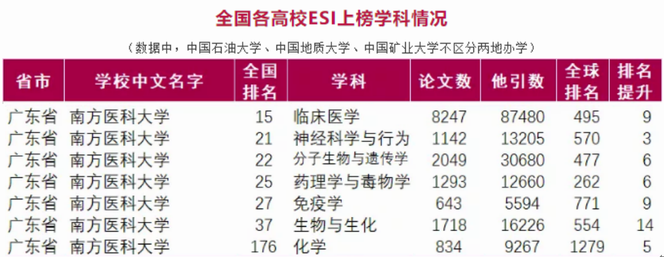 2015年以来,南医大紧紧围绕高水平医科大学建设目标,着力提升学科内涵建设水平,累计新增6个ESI世界前1%学科,增幅排名位居全国医科院校第一。学校总体排名居全省高校第3、内地高校第58,体现了学校雄厚的学科基础和强劲的发展潜力。近年来,作为全国首批、广东省唯一一所"教育部-国家卫健委-广东省政府"共建高校、广东省高水平大学整体建设高校,学校大力实施质量立校、科技强校、人才兴校、附属医院协同发展、国际化办学战略,事业发展取得显著进步,办学水平和综合实力迈上新台阶。