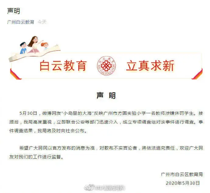 另外,白云区教育局的通报中表示,2019年12月12日学校已对刘妍老师的体罚不当行为,进行了职务暂停、全校通报批评等处罚。