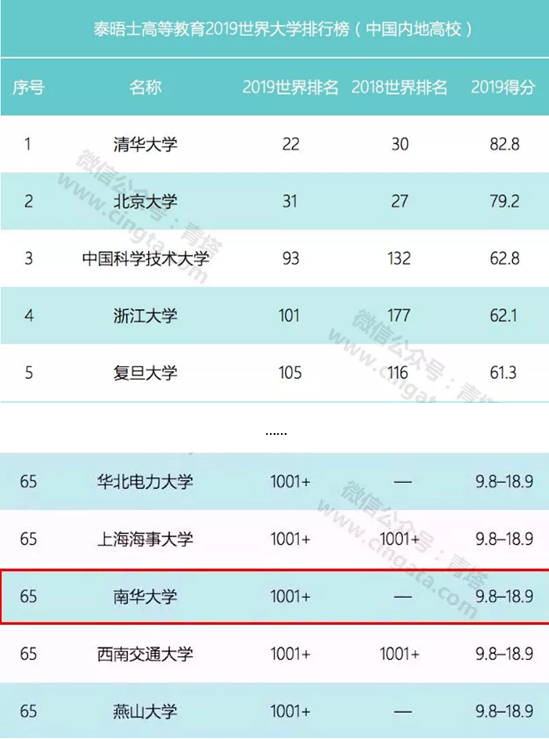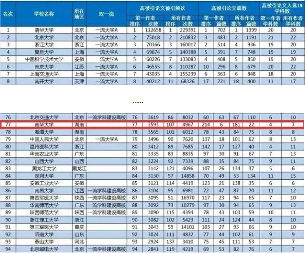 南华大学入围《2019泰晤士高等教育》世界大学排行榜,并列内地高校第65名;位列《校友会2018中国大学ESI高被引论文排行榜》第77位、名列省属高校第一。