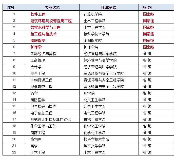 2020年1月,教育部下发《教育部办公厅关于公布2019年度国家级和省级一流本科专业建设点名单的通知》,公布了首批国家级一流本科专业建设点名单。南华大学6个专业入选国家级一流本科专业建设点,16个专业入选省级一流本科专业建设点。
