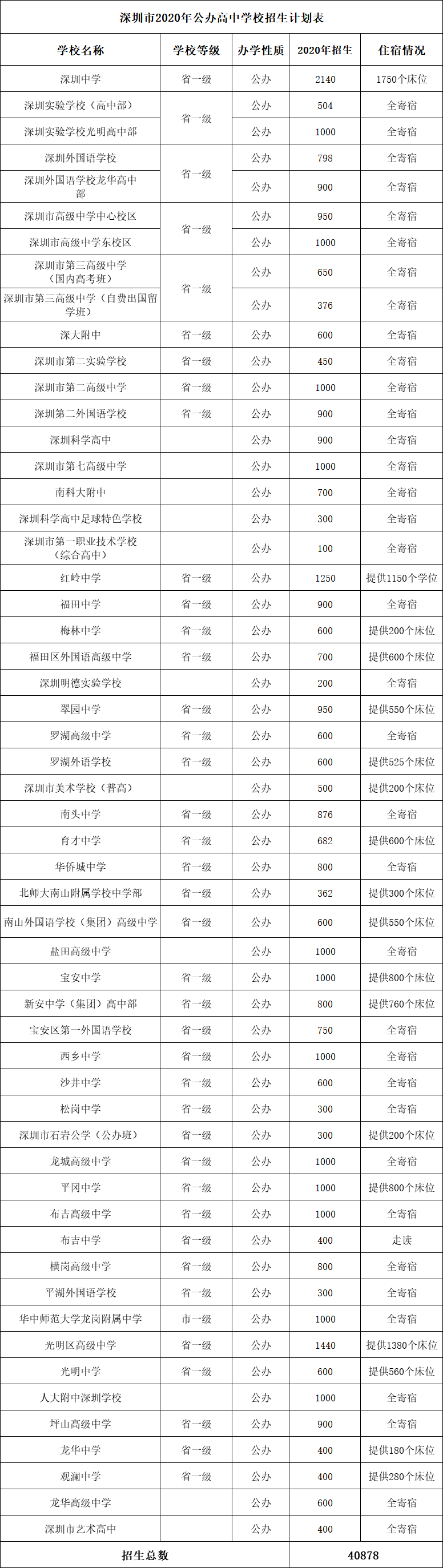 深圳公办高中住宿情况一览:(参考2020年招生计划)