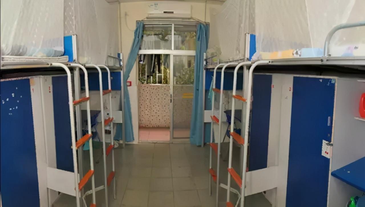 宿舍每八人住一间,一间有五张床,三张上下铺和两个上铺下桌。