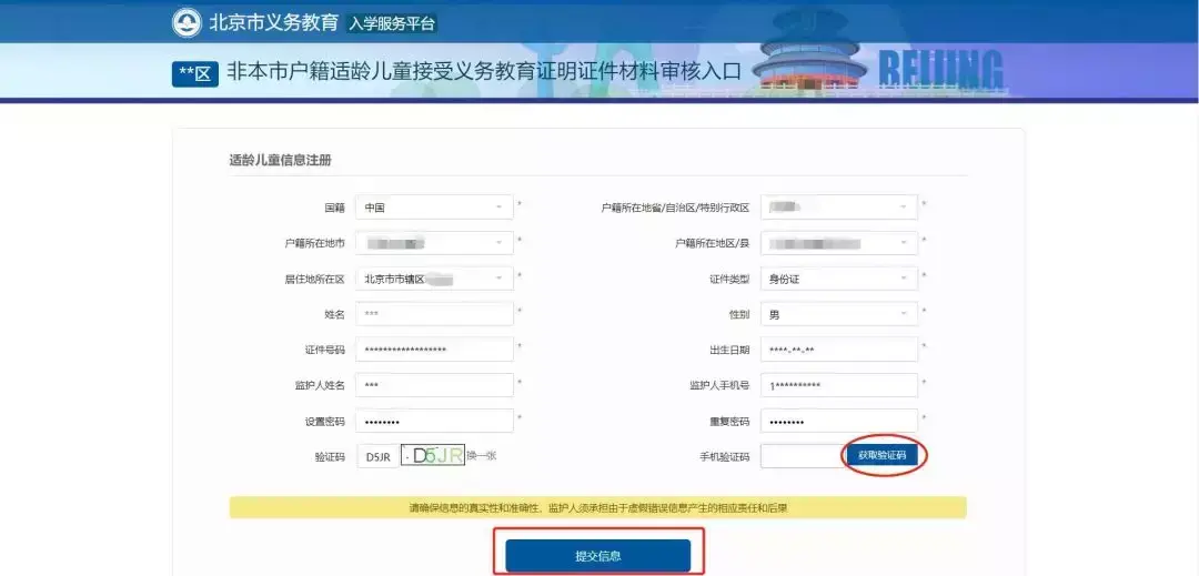 说明:为减少用户重复注册的工作量,非本市户籍适龄儿童接受义务教育证明证件材料审核通过后,用户注册及填写的详细信息将同步至“小学入学服务系统”。用户名和密码不变。