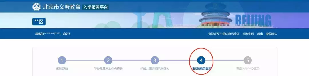 4. 成功登录小学入学服务系统后,确认在“非本市户籍适龄儿童接受义务教育证明证件材料审核入口”系统注册并同步到此系统内的信息无误后,用户可点击上方步骤导航处的“④”,打印信息采集表,系统将打开新的页面显示信息采集表。