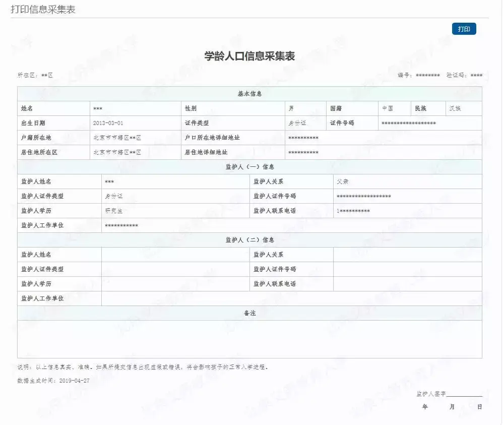 1. 打印出来的信息采集表是到小学报名时的必备材料;
