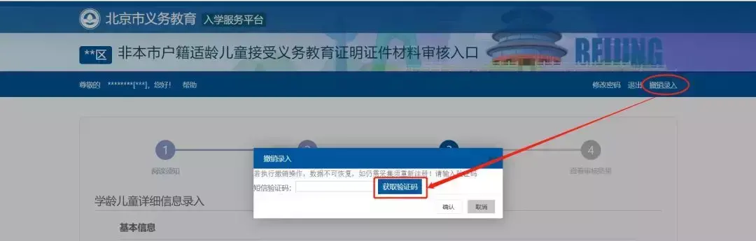 ■ 登录非本市户籍适龄儿童接受义务教育证明证件材料审核入口后点击右上角的“撤销录入”。