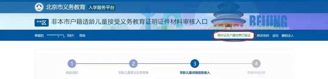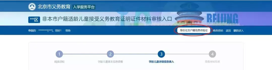 1. 用注册时生成的账号和密码登录“非本市户籍适龄儿童接受义务教育证明证件材料审核入口”,登录系统后可查看页面右上角的信息状态。