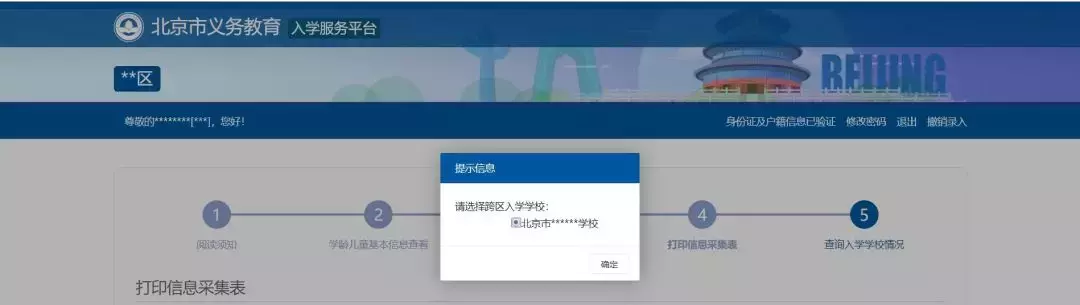 意愿参加民办校跨区招生的学生,携信息采集表在学校报名并在学校预接收后,通过登录小学入学服务系统点击上方步骤导航处的“⑤”,系统弹出跨区申请确认对话框,进行跨区入学学校确认提交。