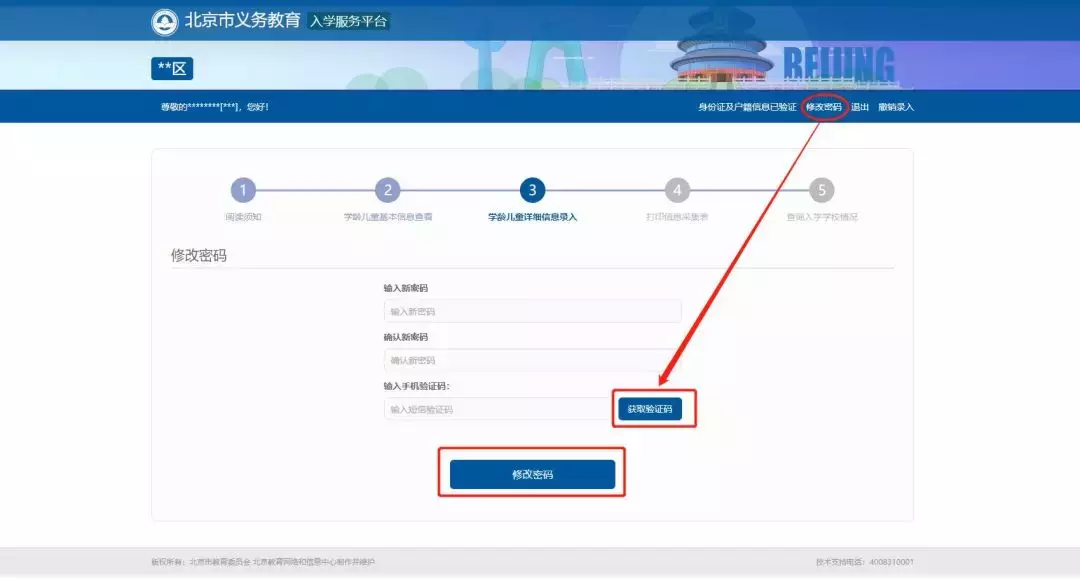 4. 输入两次完全一致的密码和短信验证码后,点击“提交信息”按钮,系统提示“修改成功”即说明密码修改成功。下次登录请使用修改后的密码。