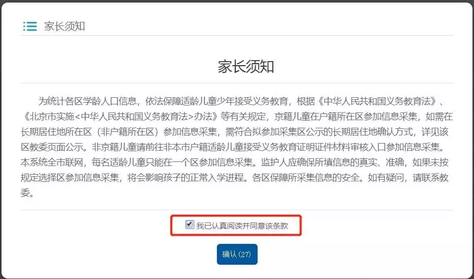 4. 进入注册页面,在填写信息前请认真阅读家长须知,30秒后勾选中“我已认真阅读并同意该条款”并点击“确认”按钮。