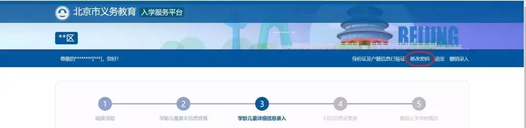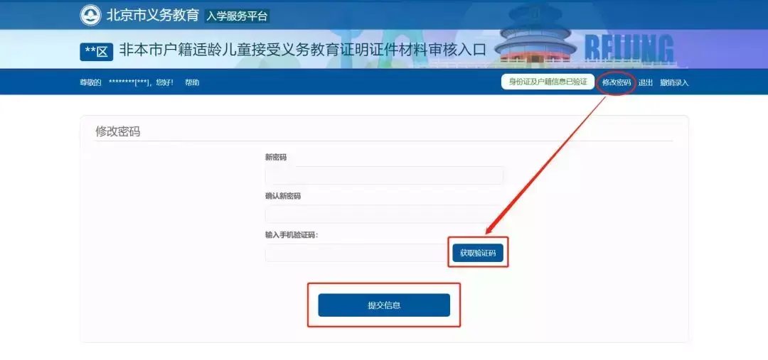 ■ 成功登录非本市户籍适龄儿童接受义务教育证明证件材料审核入口后点击右上角的“修改密码”。