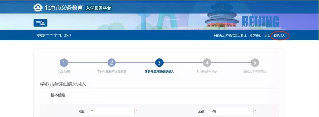 ■ 登录“小学入学服务”系统后点击右上角的“撤销录入”。