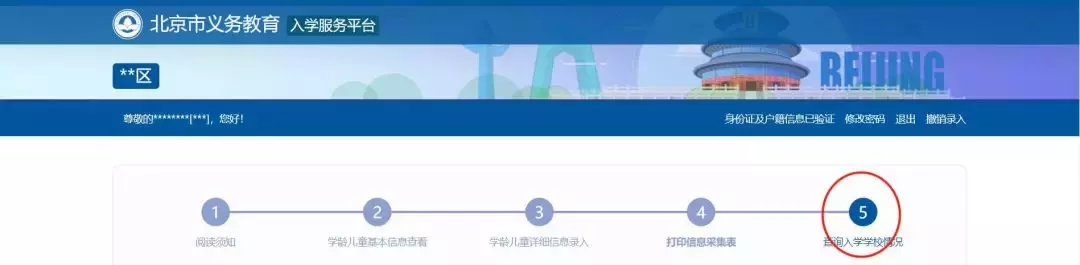 携带信息采集表到学校报名后,用户可登录小学入学服务系统后点击上方步骤导航处的“⑤”,查看入学结果。
